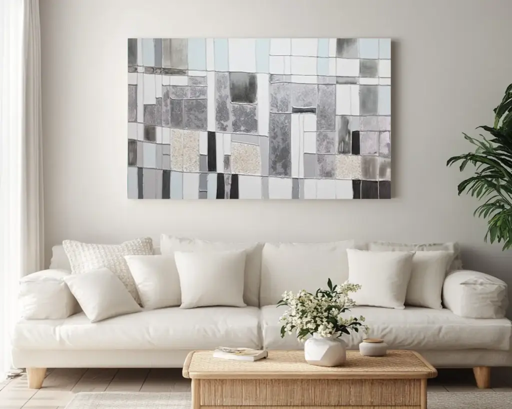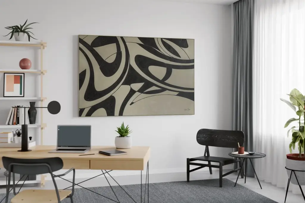 Abstrakte Kunst gibt es in einer Vielzahl von Farbschemata. Manche Hausbesitzer entscheiden sich für monochromatische Werke, um eine schlichte, minimalistische Ästhetik zu schaffen. Schwarze und weiße abstrakte Kunstwerke haben eine zeitlose Anziehungskraft und fügen sich nahtlos in neutrale Interieurs ein, während lebhafte, kräftige Werke einem Raum Energie und Kontrast verleihen. Die Wahl zwischen Monochromie und kräftigen Farben hängt letztlich von der Stimmung ab, die Sie erzeugen möchten, und davon, wie das Kunstwerk mit anderen Designelementen im Raum interagiert.