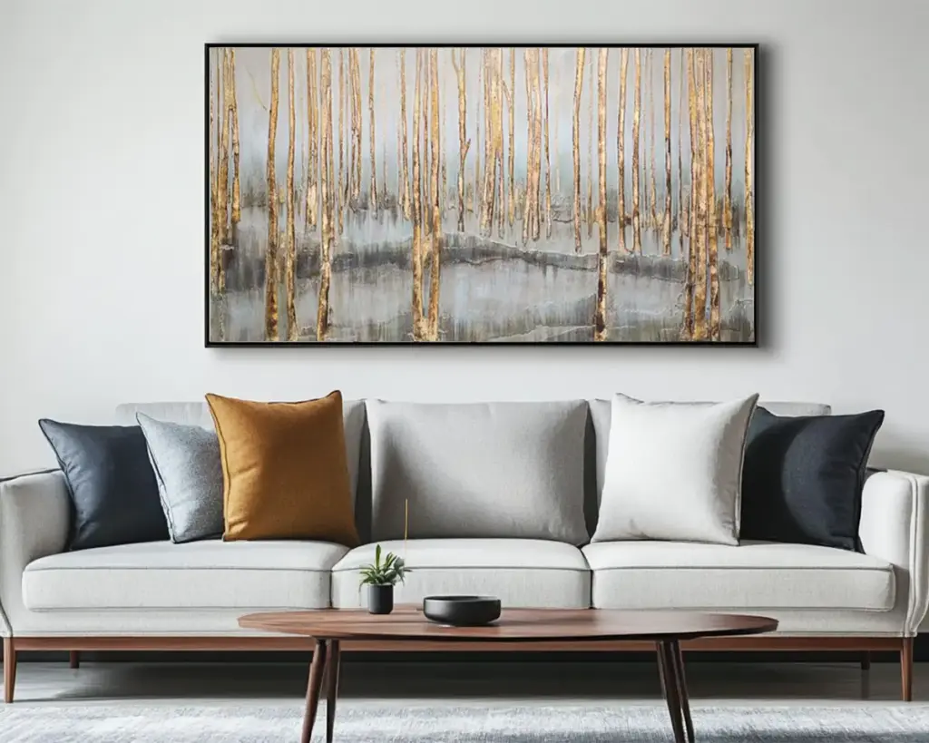 Die Rahmung abstrakter Kunst hängt vom Stil des Kunstwerks und Ihrer Einrichtung ab. Ein schlichter, minimaler Rahmen (z. B. ein dünner schwarzer, weißer oder metallischer Rahmen) eignet sich gut für moderne Räume, während ein schwebender Rahmen Tiefe verleihen kann, ohne vom Kunstwerk abzulenken. Bei mutigen, großformatigen Werken ist eine rahmenlose Leinwand oft am wirkungsvollsten. Stellen Sie das Kunstwerk in Augenhöhe auf – in der Regel etwa 57 bis 60 Zentimeter über dem Boden. Wenn Sie mehrere Werke aufstellen, sollten Sie eine galerieartige Anordnung mit gleichmäßigen Abständen in Erwägung ziehen, um ein zusammenhängendes Bild zu schaffen.