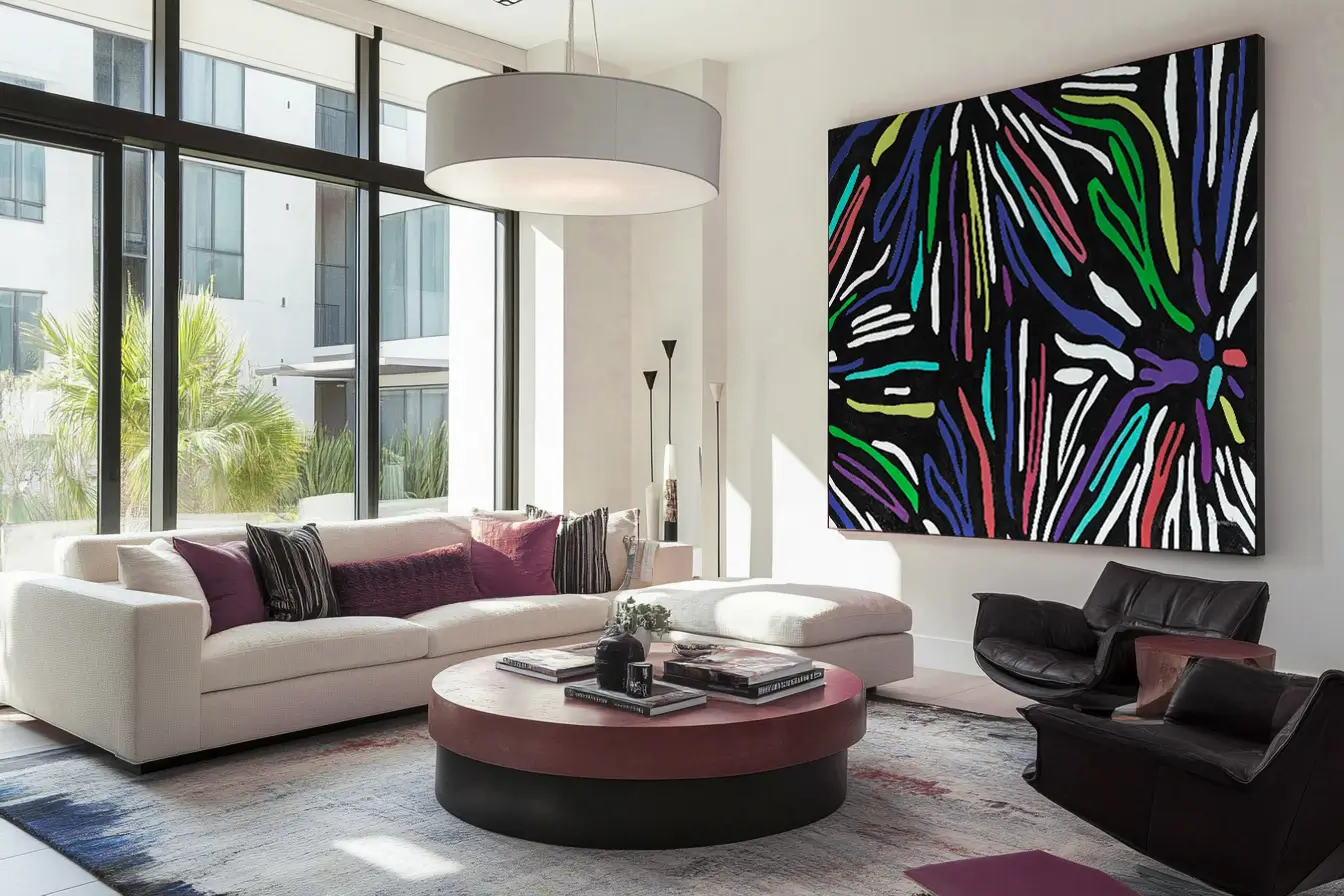 Luxuswohnungen sind oft mit exklusiven, einmaligen abstrakten Kunstwerken ausgestattet. Kunstsammler und Innenarchitekten nutzen solche Werke, um ihren persönlichen Geschmack zu zeigen und die Raffinesse eines Raums zu unterstreichen.