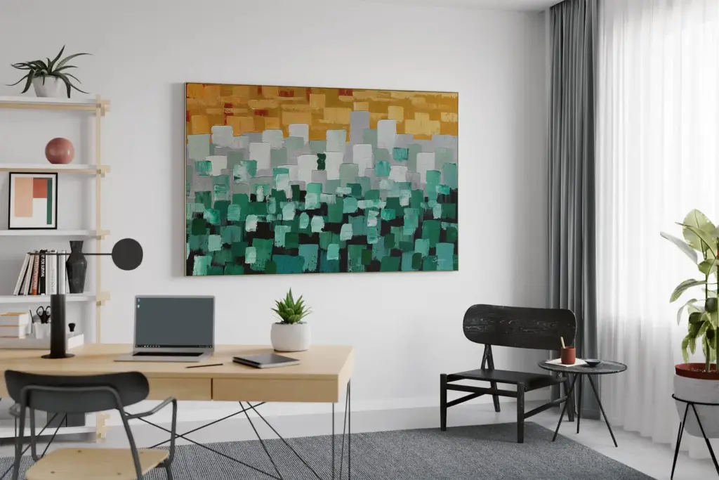 Bei der Auswahl abstrakter Kunstwerke für Ihren Raum ist es wichtig, die Farbpsychologie zu verstehen, da Farben die Stimmung beeinflussen – warme Töne wie Rot, Orange und Gelb erzeugen Energie, während kühlere Farbtöne wie Blau, Grün und Violett Entspannung fördern. Die Auswahl eines Kunstwerks, das zur gewünschten Stimmung passt, kann die Atmosphäre eines Raums verändern. Ein kleines abstraktes Kunstwerk kann an einer großen Wand verloren gehen, während ein übergroßes Kunstwerk in einem kleinen Raum überwältigend wirken kann. Das richtige Gleichgewicht sorgt dafür, dass das Kunstwerk den Raum aufwertet, anstatt ihn zu stören.