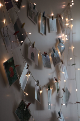 Hier sind der Fantasie keine Grenzen gesetzt. Je bunter und außergewöhnlicher die Komposition, desto besser. Kombinieren Sie Schwarz-Weiß mit farbenfrohen Fotos, stellen Sie alles zur Show, das Sie begeistert und inspiriert – die Themenauswahl ist bei diesem Motto unbegrenzt. Auch die Formate dürfen unterschiedlich groß sein und in ihrem Abstand asymmetrisch. Besonders kreativ wirkt diese Bilderwand, wenn die Formation der Bilder außergewöhnlich ist. Beispielsweise lassen sich Fotos mit Wäscheklammern an einer Lichterkette befestigen. Viele Lichterketten, gleichmäßig untereinander arrangiert, ergeben eine Bildergalerie mit Wow-Effekt. Statt ausgewählte Bilder linear nebeneinander oder untereinander anzubringen, können Sie sie auch in einer besonderen Form wie einem Herzen oder einem Stern in Szene setzen.