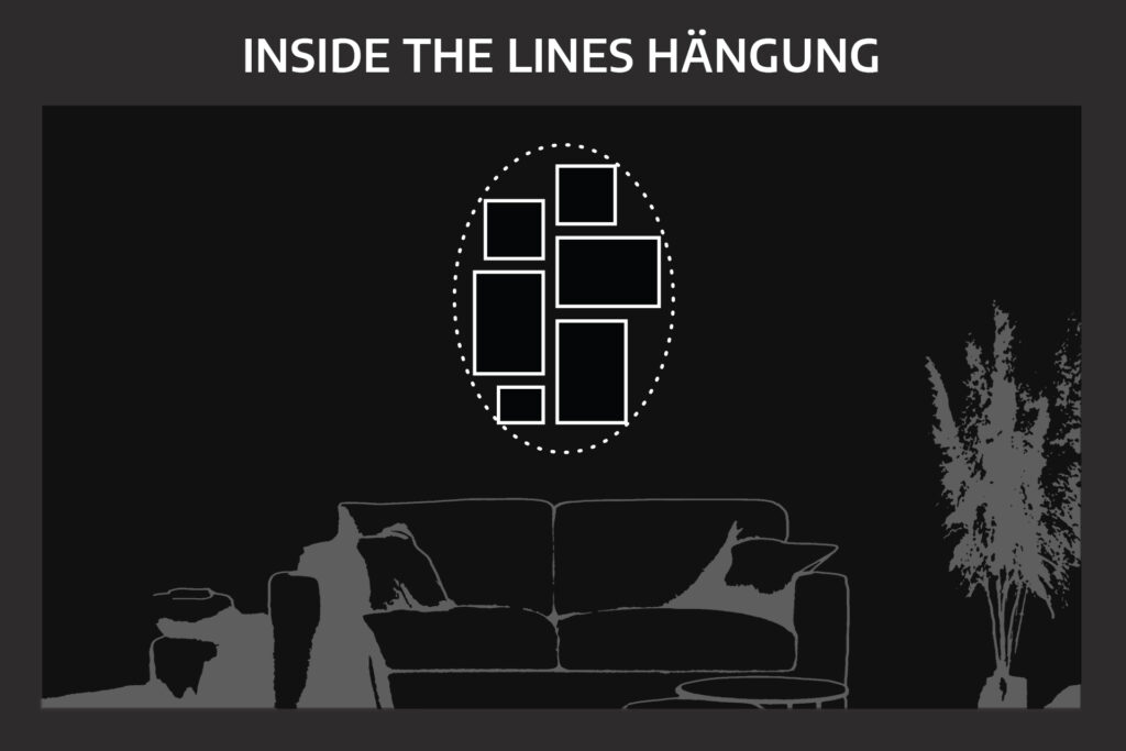 Der Freigeist unter den Hängevarianten ist die Inside the Lines Hängung. Denn Blickachsen, Formate, Abstände und Motivwahl spielen hier keine Rolle. Die Anordnung der Bilder wird von Ihnen bestimmt, indem Sie sich vorab eine geometrische Form überlegen, die der Hängung eine optische Struktur vorgibt.