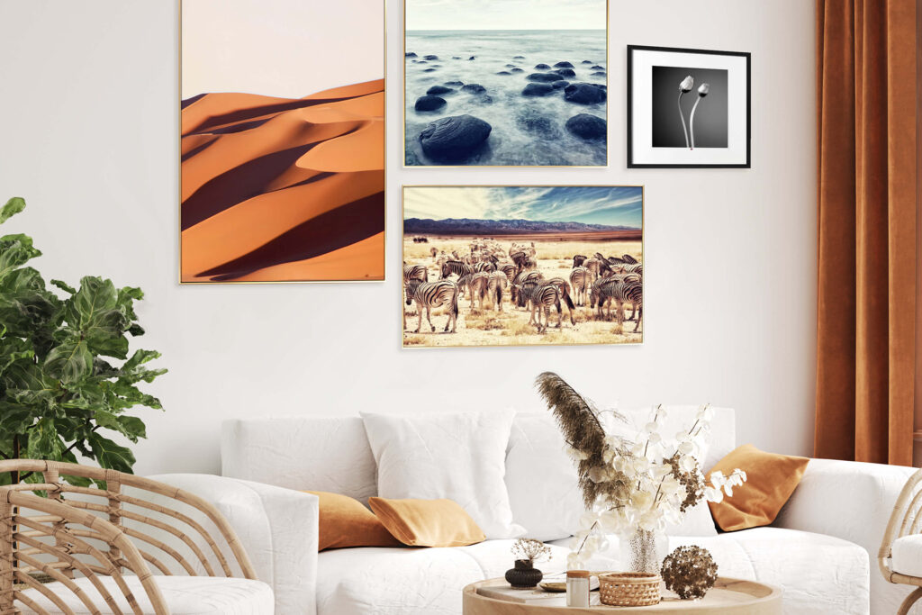 Für eine harmonische Gestaltung ist ein roter Faden das A und O. Dieses Merkmal kann sich in vielfältiger Weise zeigen: durch ein übergreifendes Thema wie z. B. Natur, Blumen, ferne Länder oder durch die Wahl einer bestimmten Farbfamilie. Jede Farbe ist erlaubt, Hauptsache alle Bilder stehen im Einklang ihrer Farbgebung. Ob Motive in Pastelltönen, in kühlen Farbnuancen wie Blau und Türkis oder in schlichtem Schwarz-Weiß – schenken Sie Ihrer Lieblingsfarbe einen Platz zur Entfaltung. Verstärkt wirkt der übereinstimmende Effekt Ihrer Wand, wenn alle Bilder einheitlich gerahmt sind.
