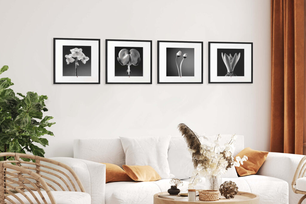 Perfekt für die Reihenhängung bieten sich unsere gerahmten Kunstfotografien im Schwarz-Weiß-Look an. Die Bilder zeigen realistische Detailaufnahmen von Blumen und sind nicht nur für Botanik-Fans ein stilvoller Blickfang