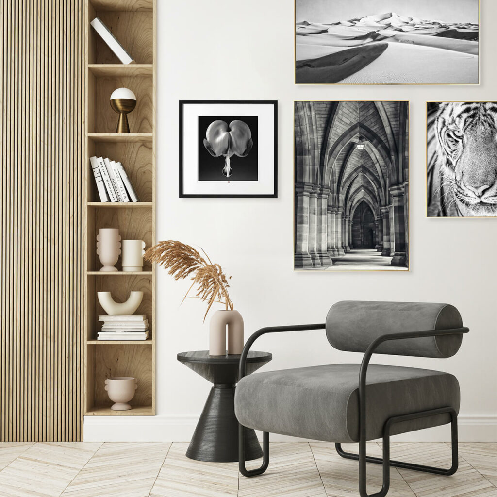 Beim modernen Wohnstil lautet die Devise: Weniger ist mehr. Hier wird Wert auf Exklusivität und zeitlose Dekoelemente gelegt. Perfekt dazu passt eine Fotocollage zu thematisch verwandten Themen im Galeriedesign. Ausgewählte Fotografien in Schwarz-Weiß-Optik und schlichter Rahmung komplettieren Ihre Einrichtung. Wählen Sie eine Kombination aus verschiedenen Bildgrößen, die sich in dichter Anordnung überlagern und dadurch einen fließenden Übergang zwischen der Bildervielfalt generieren. Stilvolle Motive, die sich gut mit dem modernen Stil vereinbaren lassen, sind Landschaften, Tier- und Menschenporträts sowie architektonische, abstrakte und grafische Fotodesigns.