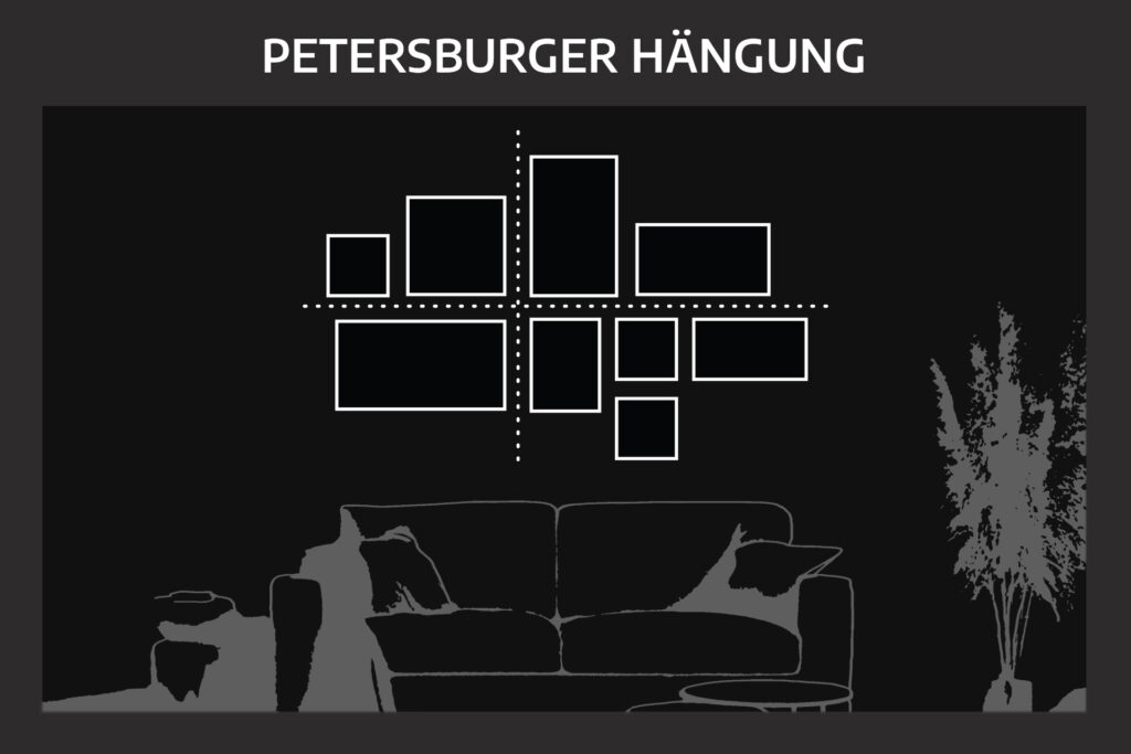 Für die Petersburger Hängung, die auch unter dem Namen “Salonhängung” bekannt ist, trifft das Prinzip organisiertes Chaos zu. Ihren Ursprung hat sie als bedeutende Kunstsammlung im berühmten russischen Kunstmuseum der St. Petersburger Eremitage. Auf 350 Säle verteilt, hängen hier insgesamt über 60.000 Kunstwerke dicht bis unter die Decke. Die opulente Bildersammlung soll beeindrucken und zum Kauf von Kunst anregen. Typisch für diese Hängung ist, dass sich unterschiedliche Bilder zu einem interessanten und harmonischen Gesamtkunstwerk verbinden. Sie ist heute noch in vielen Schlössern und Museen vertreten und mittlerweile auch im Einrichtungsbereich eine beliebte Art, Wände zu schmücken. Damit die Petersburger Hängung auch im eigenen Zuhause funktioniert, haben wir einige Tipps für Sie zusammengestellt: