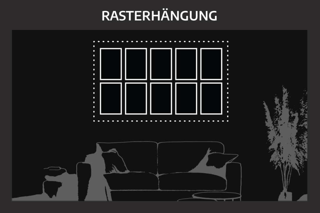 • Der Platz bestimmt die Anzahl der Fotos. Dennoch ist die Rasterhängung für alle Raumgrößen geeignet, da sie eine strukturierende Atmosphäre schaffen.