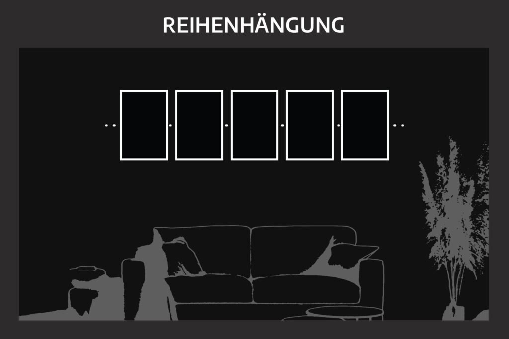 • Diese Hängung ist nicht auf ein Format festgelegt. Ob die Bilder im Hoch-, Querformat oder quadratisch sind, ist Ihre  Entscheidung.